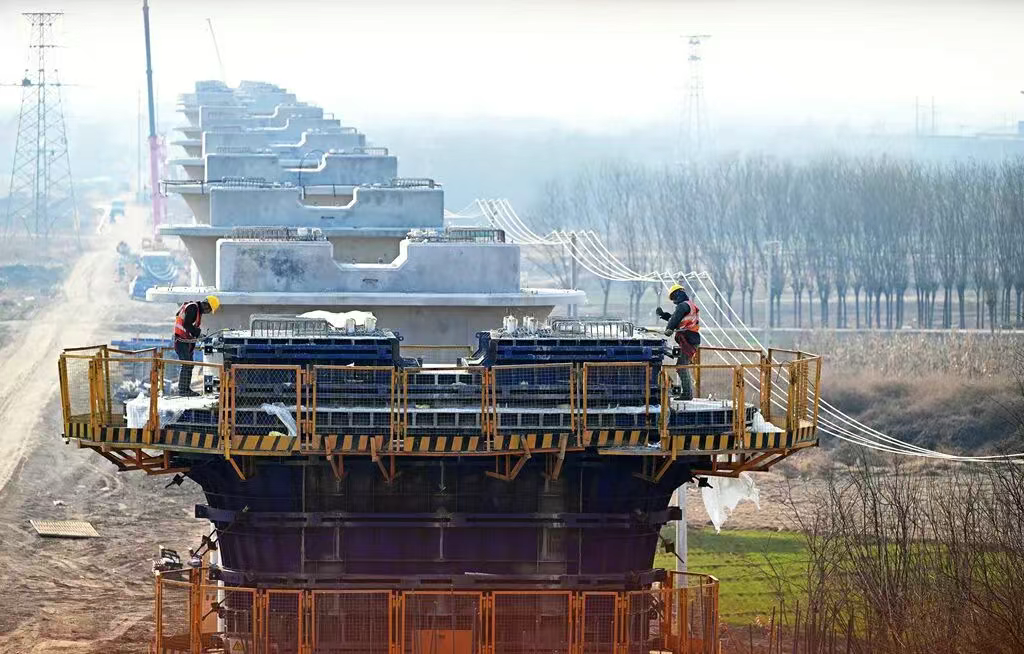 12月5日,中铁十一局建设者在石雄铁路安定特大桥16号墩施工作业。