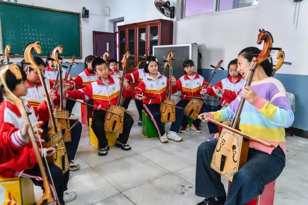在河北省承德市围场满族蒙古族自治县第一小学,学生在老师指导下练习马头琴。CICPHOTO/孙占军 摄
