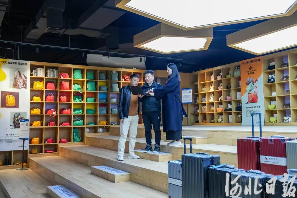 11月27日,白沟箱包数字化转型赋能中心工作人员(左二)向商户展示通过共享设计平台生成的效果图。河北日报记者 许佳奇摄