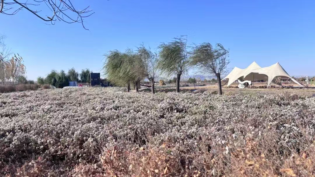 徜徉花海中,成片的菊花迎风绽放,一团团、一簇簇,白如雪,黄如金,将冬日滹沱河畔的乡村装点得如诗如画。