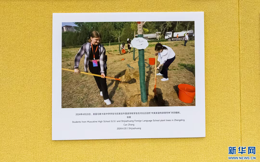 现场展出的中美学生共同植树场景。新华网 发