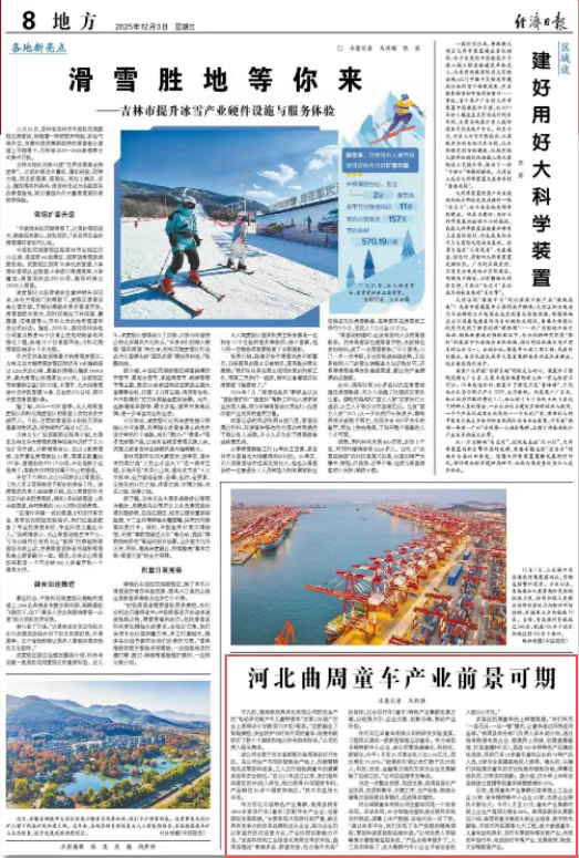 目前,曲周童车产业集群已培育规上工业企业15家、省专精特新中小企业10家,优质企业梯队不断壮大。今年1月至10月,童车产业集群内规上企业产值同比增长26%。曲周县副县长夏鹏远介绍,曲周将重点推进头部企业培育、数字技术赋能、市场双向拓展等七大工程,做大做强童车、儿童电动玩具车、自行车零部件等优势产业,布局老年助行车、电动助行车等产业,发展商贸、物流、文创等配套产业。