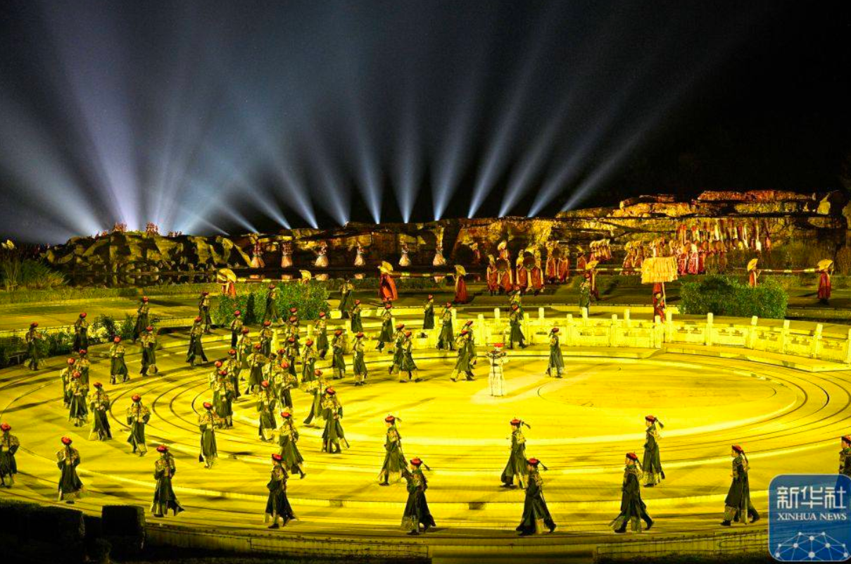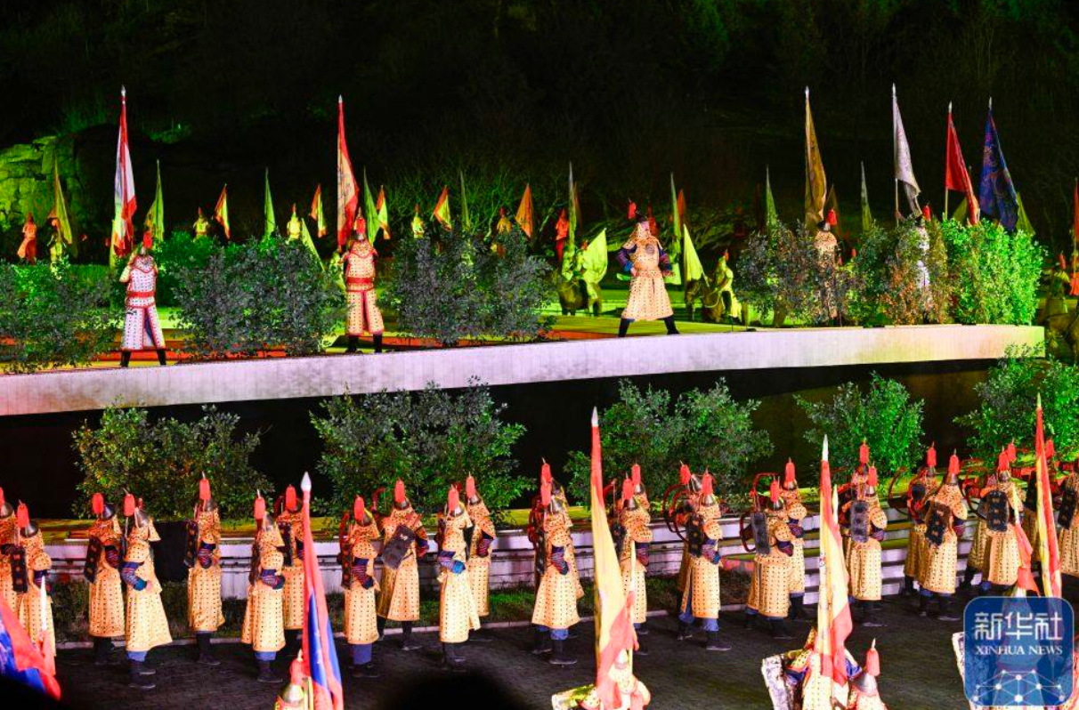 4月18日,大型实景演出《鼎盛王朝·康熙大典》第十五演出季在河北省承德市双滦区元宝山正式首演。演出以实景山水结合沉浸式舞美设计,汲取清代康乾时期的历史脉络与皇家文化元素,数百名演员现场表演,生动再现历史场景。据介绍,该演出自2011年6月正式推出以来,已累计演出2500多场,接待游客400余万人次,被列入全国旅游演艺精品名录入选项目名单。新华社发 王立群 摄