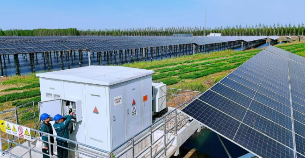 图为4月21日,国网玉田县供电公司员工正在"渔光一体"光伏电站巡检作业。陈汝健摄