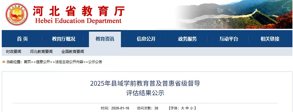 根据教育部《县域学前教育普及普惠督导评估办法》和《河北省县域学前教育普及普惠督导评估工作方案》规定,河北省教育厅组织评估组对唐山市曹妃甸区、唐山海港经济开发区,石家庄市桥西区,张家口市康保县,秦皇岛市昌黎县、北戴河新区,保定市高阳县、高碑店市、阜平县、涞水县,沧州市任丘市,衡水市安平县,邢台市平乡县等13个县(市、区)进行了督导评估。经综合评估,以上13个县(市、区)基本达到县域学前教育普及普惠省级督导评估要求,拟按程序报教育部申请国家评估认定,现予以公示。公示时间为2026年1月16日至1月22日。