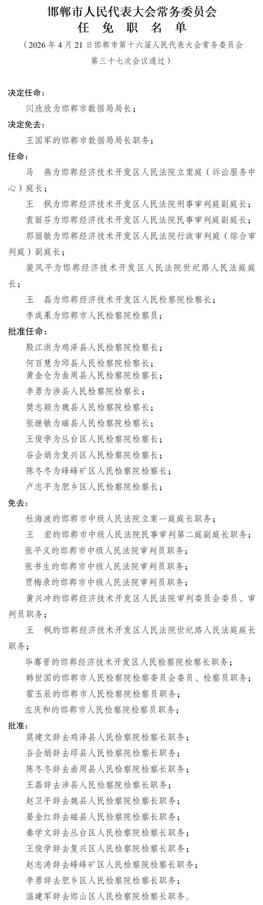 邯郸市人大常委会任免职名单