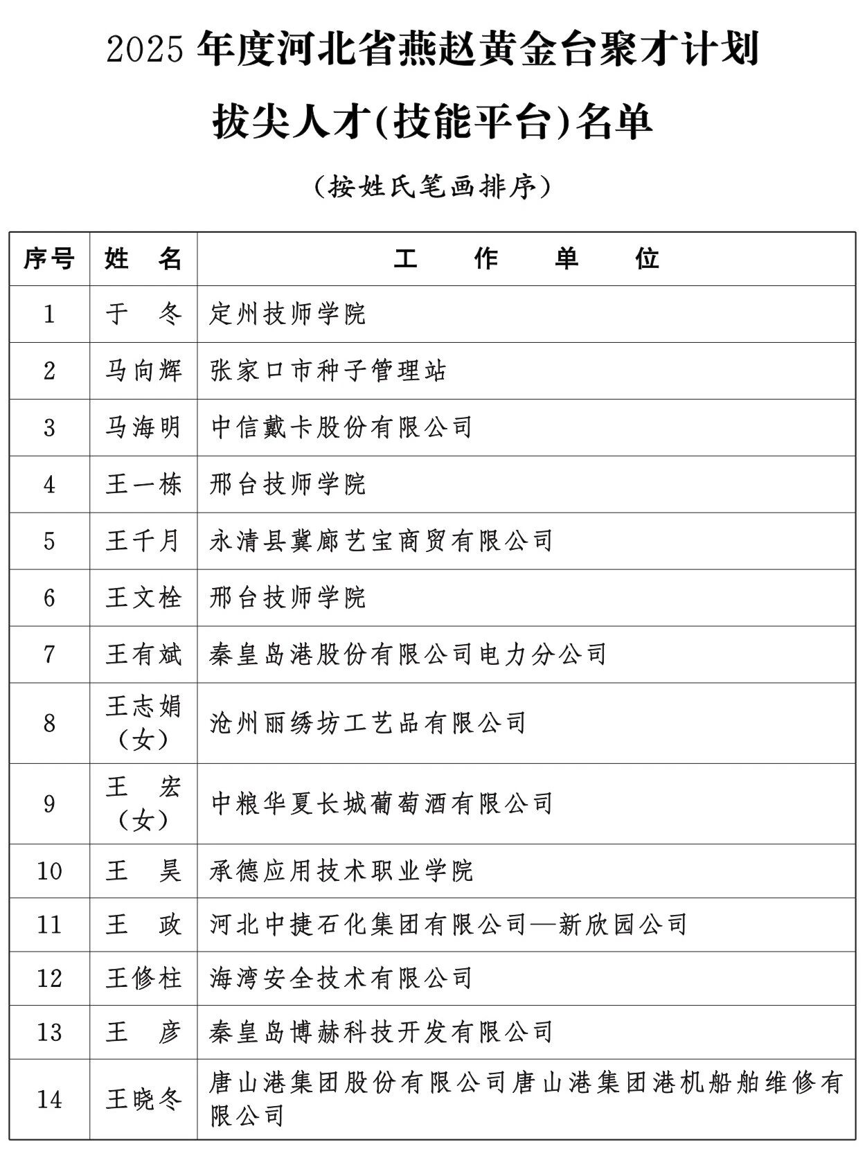 2025年度河北省燕赵黄金台聚才计划拔尖人才(技能平台)名单