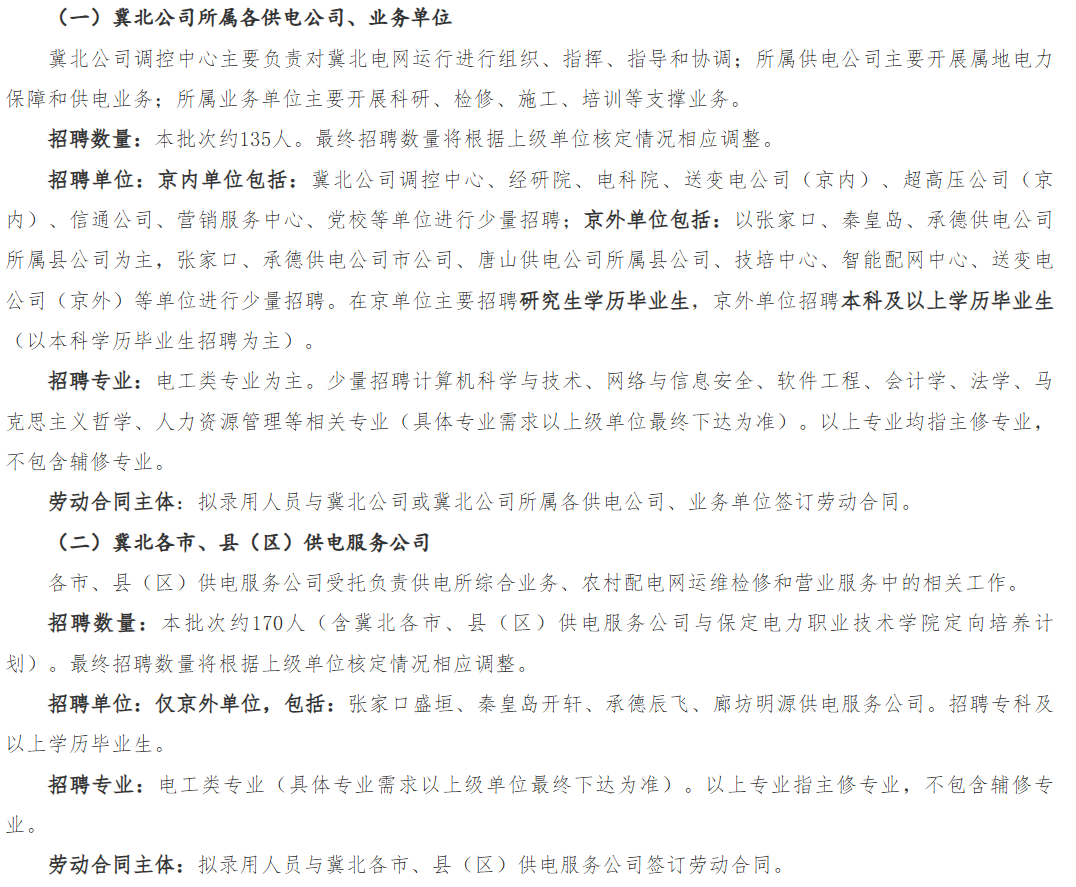 招聘专业指主修专业(不包含辅修专业)。招聘专业主要为电工类专业,少量招聘非电工类专业。根据2026年第一批招聘毕业生流失情况,进行少量补招。最终招聘数量将根据上级单位核定情况相应调整,主要招聘计划如下: