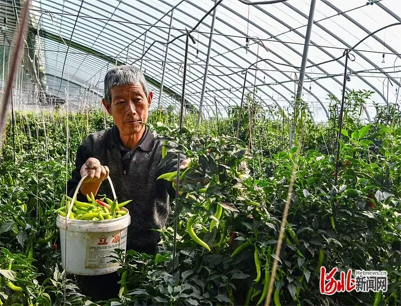 10月21日,在望都县辣椒产业种植基地,工作人员在采摘高产抗病杂交辣椒。 本组图片由侯虓摄