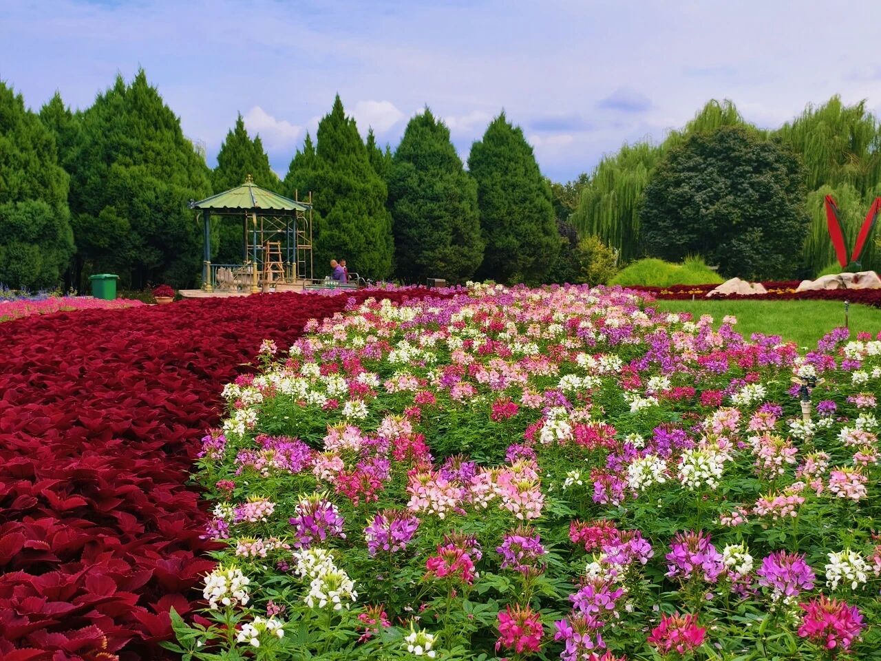 本次花展分为室内和室外两部分,室外花展主展区位于花展厅北侧,涵盖醉蝶、百日草、彩叶草、矮牵牛、金光菊、香彩雀等10余个品种,其中,醉蝶花以玫红、白、紫三色交织出梦幻花浪,橘黄、粉红的百日草花瓣层层叠叠,红色与芥末黄的彩叶草叶片相映成趣,将整个园区装点成色彩饱满的秋日画卷。