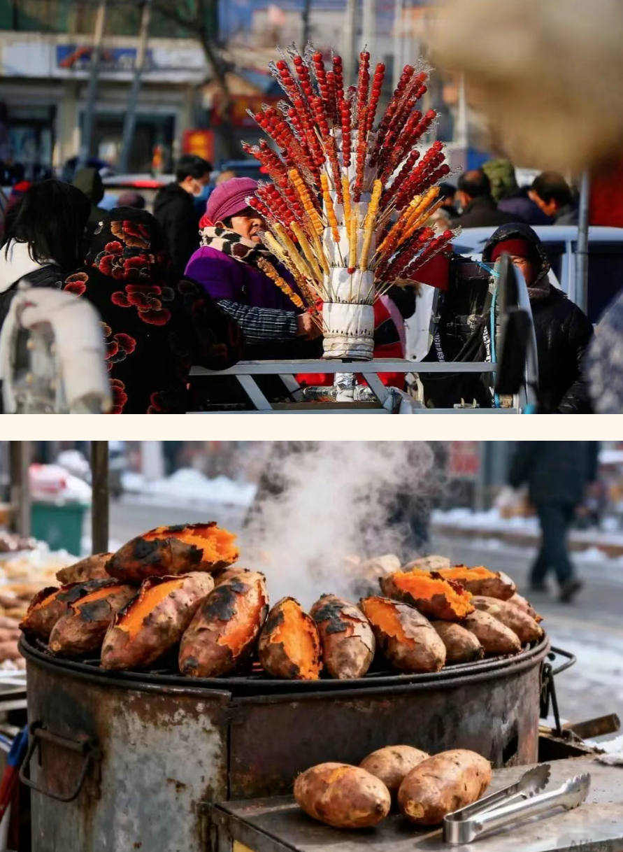 还有街头巷尾的打爆米花,一声巨响过后,雪白的米花装满布袋,是孩子们最爱的新年零嘴;铁锅炒花生滋滋冒香,红衣爆开裹着焦甜,随手抓一把都是年味;裁红纸写对联,笔墨飘香间把吉祥话写满门楣;腊月二十三必买糖瓜甜丝丝,盼着祭灶祈福来年顺遂,再攥一串红彤彤的糖葫芦,酸甜滋味甜到心头;街边烤红薯暖手又暖胃,焦香软糯甜到心坎;油锅滋滋炸油条、炸麻叶,金黄酥脆的油条蓬松暄软,麻叶层层香酥掉渣,每一口都是腊月里的烟火甜香。热气腾腾的烟火,热热闹闹的互动,藏着最质朴的团圆喜乐,是刻在心底最值得回味的年味儿。