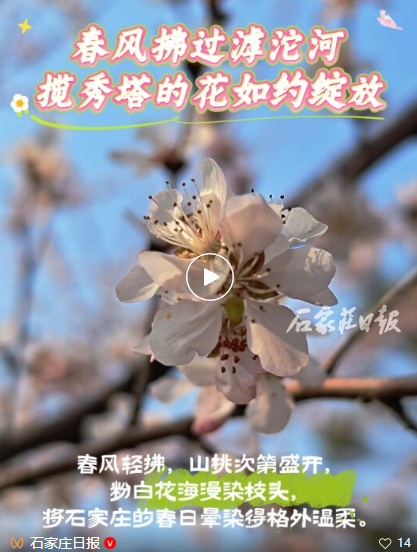 “这片林子有1300多棵山桃,树龄在10年左右。现在已进入最佳观赏期,由于山桃花期较短,预计花期将持续到3月底。喜欢山桃花的朋友,可以来此,赴一场春日之约。”石家庄市园林局城市水系园林中心工作人员李志楠介绍说。