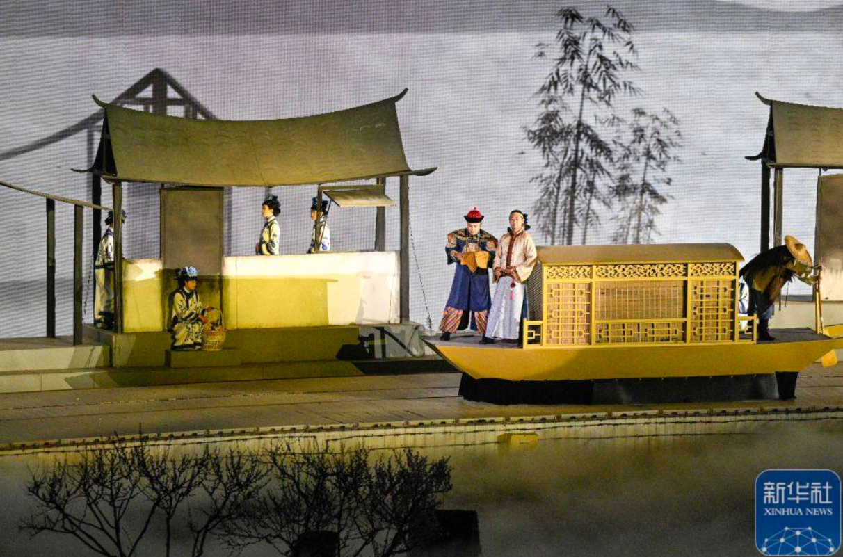 ↑4月8日晚,演员在大型实景演出《鼎盛王朝·康熙大典》中表演。