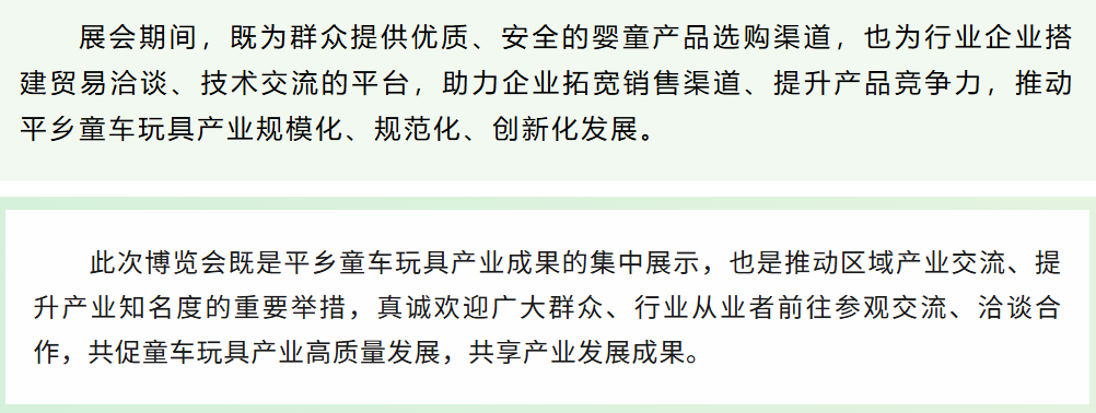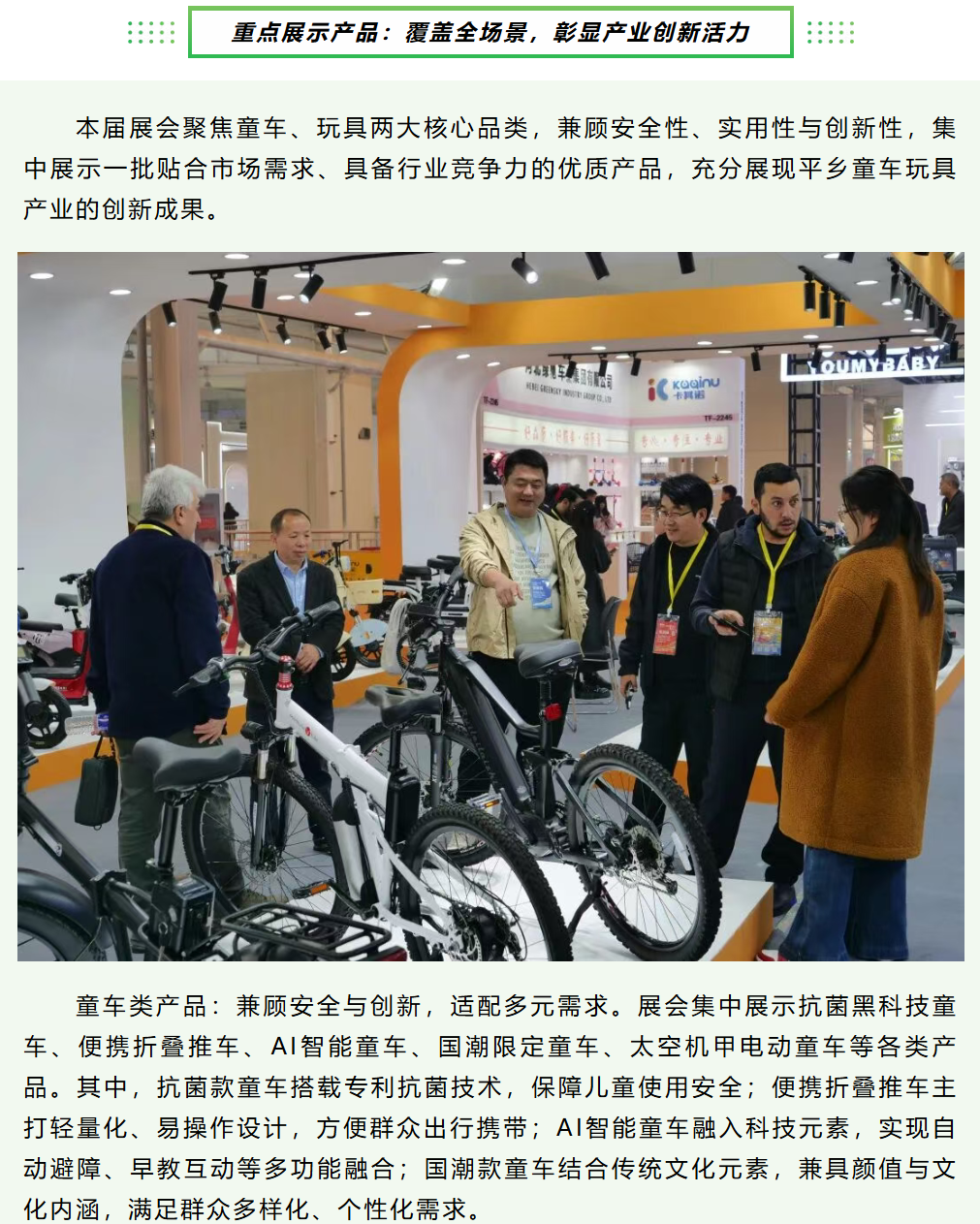 为进一步推动童车玩具产业高质量发展,搭建行业交流合作平台,第二十一届河北平乡国际自行车童车玩具博览会,将于4月24日在平乡国际会展中心正式开幕。本届博览会汇聚全产业链优质资源,集中展示行业前沿产品与创新成果,为产业发展注入新动能,也为群众选购优质婴童产品提供便利。